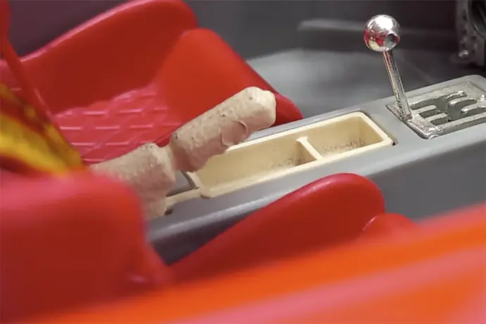 In addition to the aforementioned difference in colour between the two interior components (roof headliner and handbrake), the product arrived in stores with simpler packaging and a plastic base.