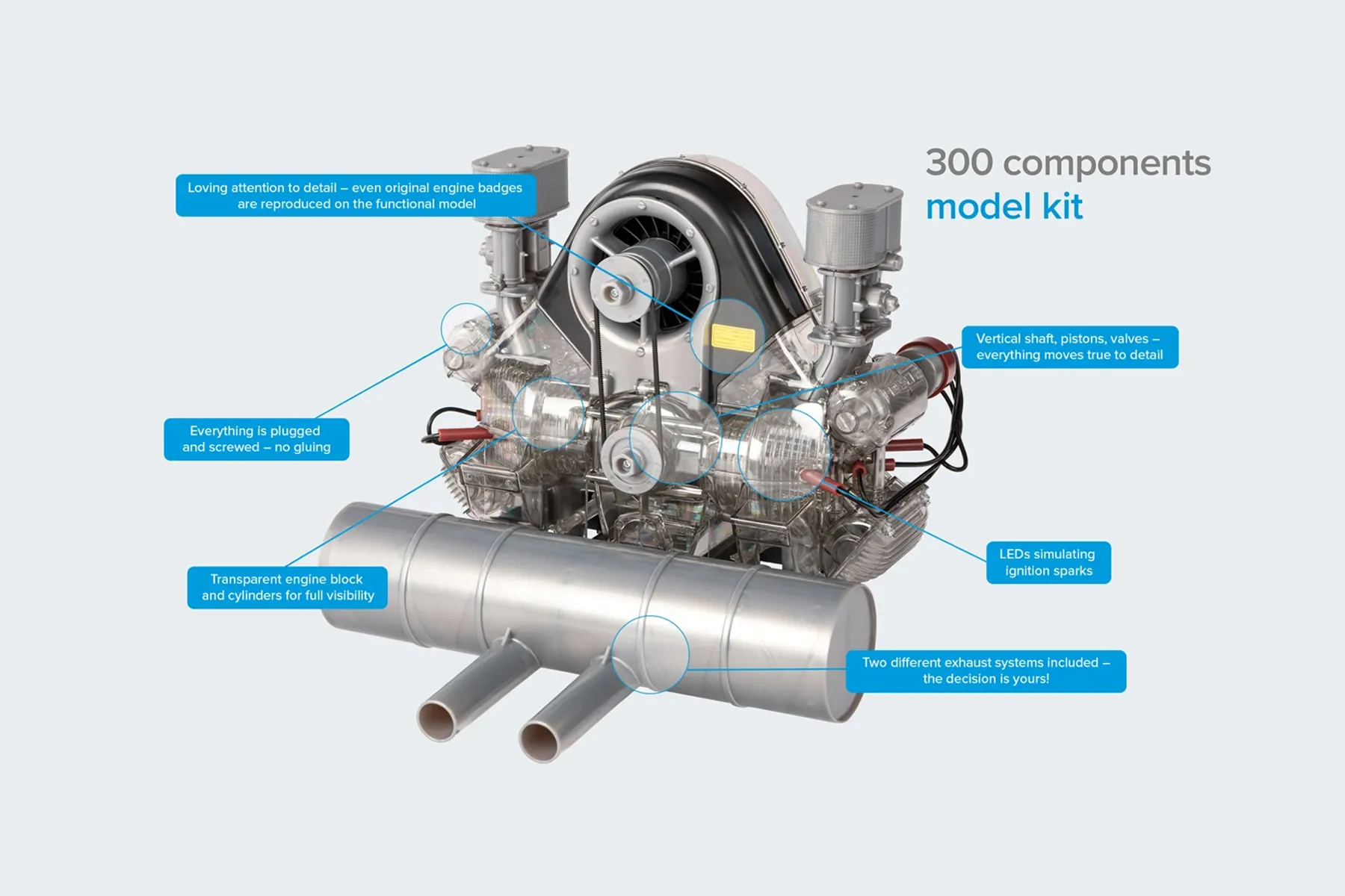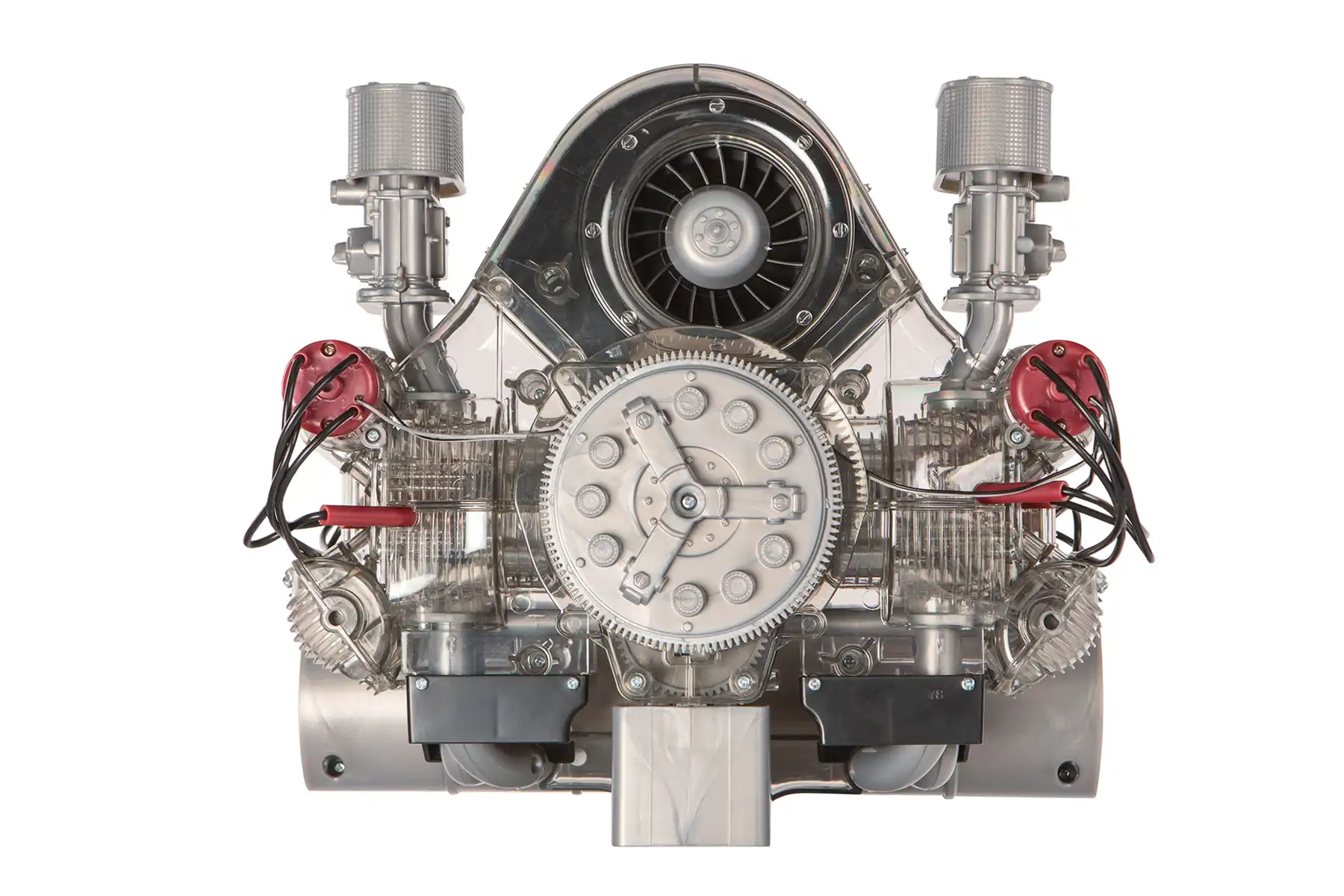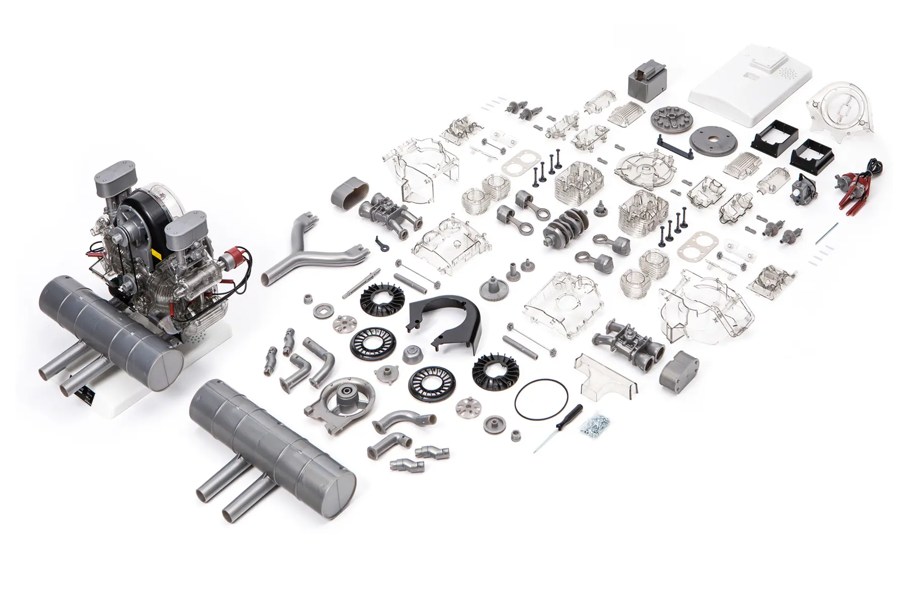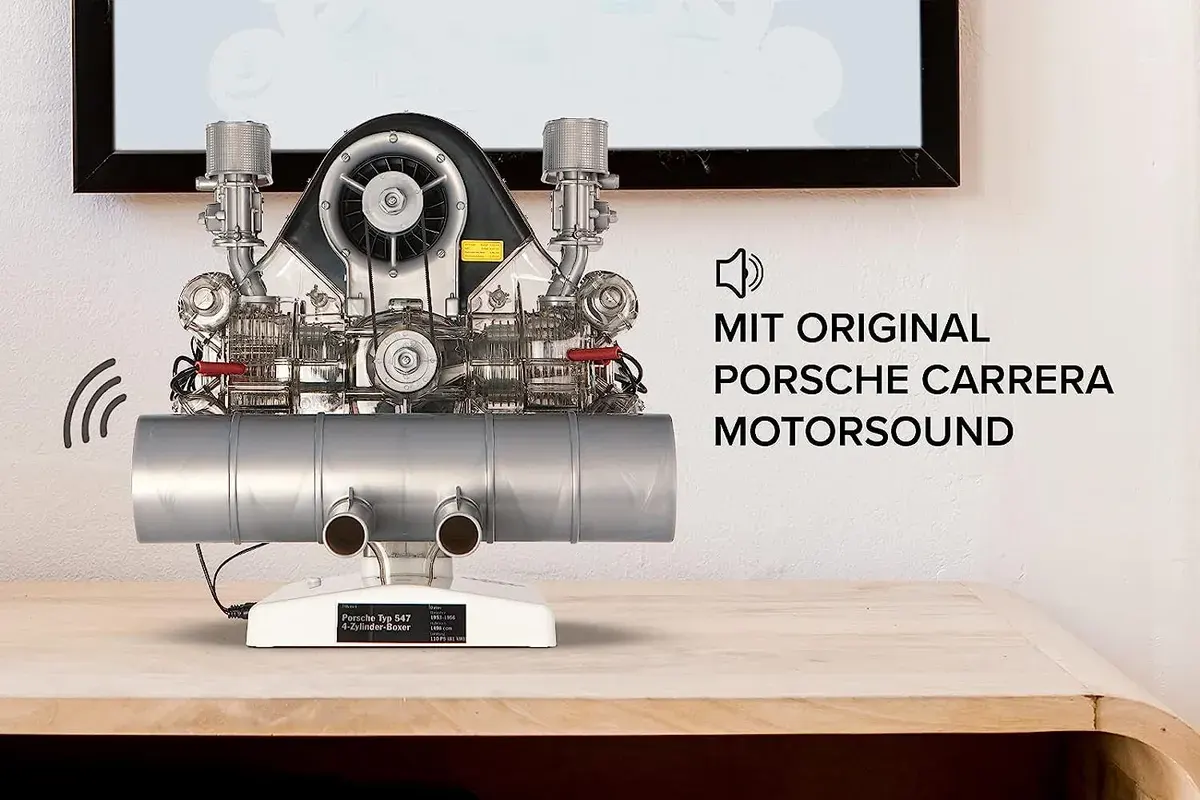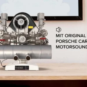 1:3 scale model kit of the engine designed by Ernst Fuhrmann at Porsche during the company’s early years. It is a classic four-cylinder boxer engine (1.5-litre version), with a complex double overhead camshaft layout and designed for competition. It was first used in the Porsche 550 ‘A’.
