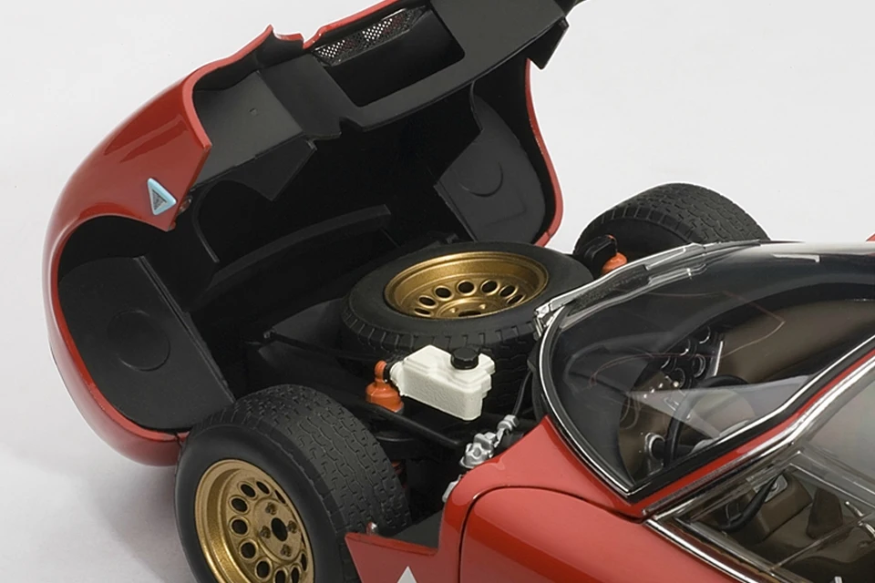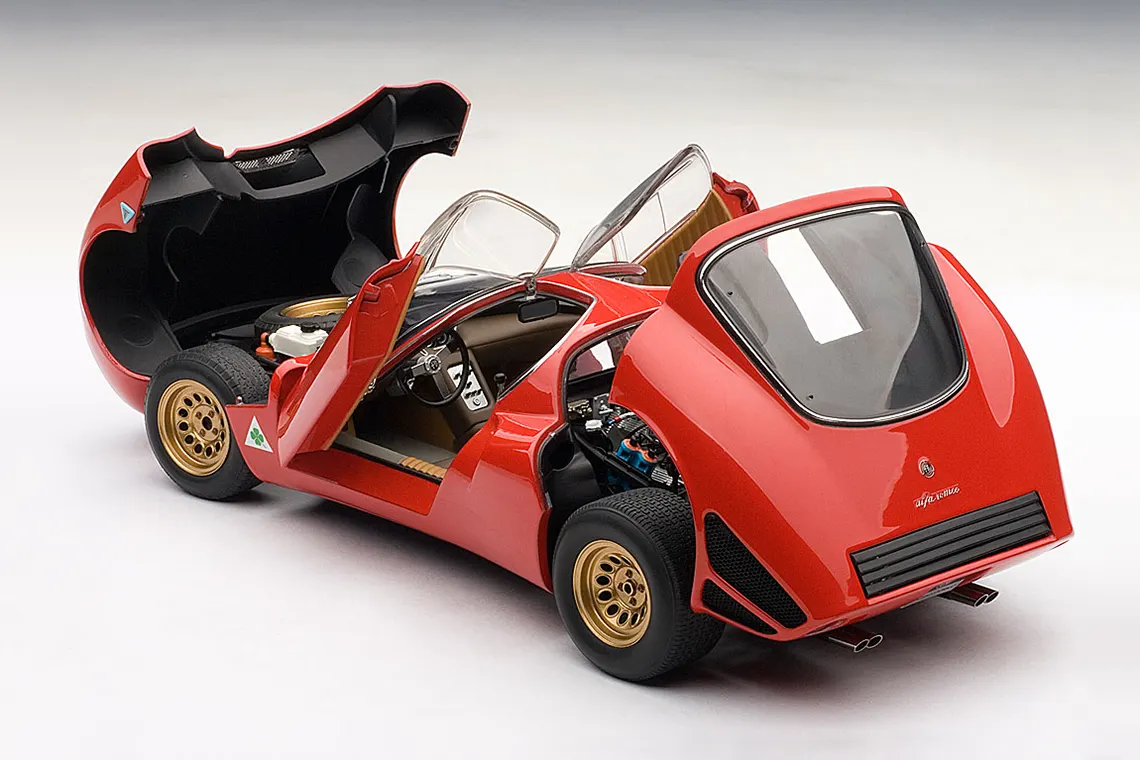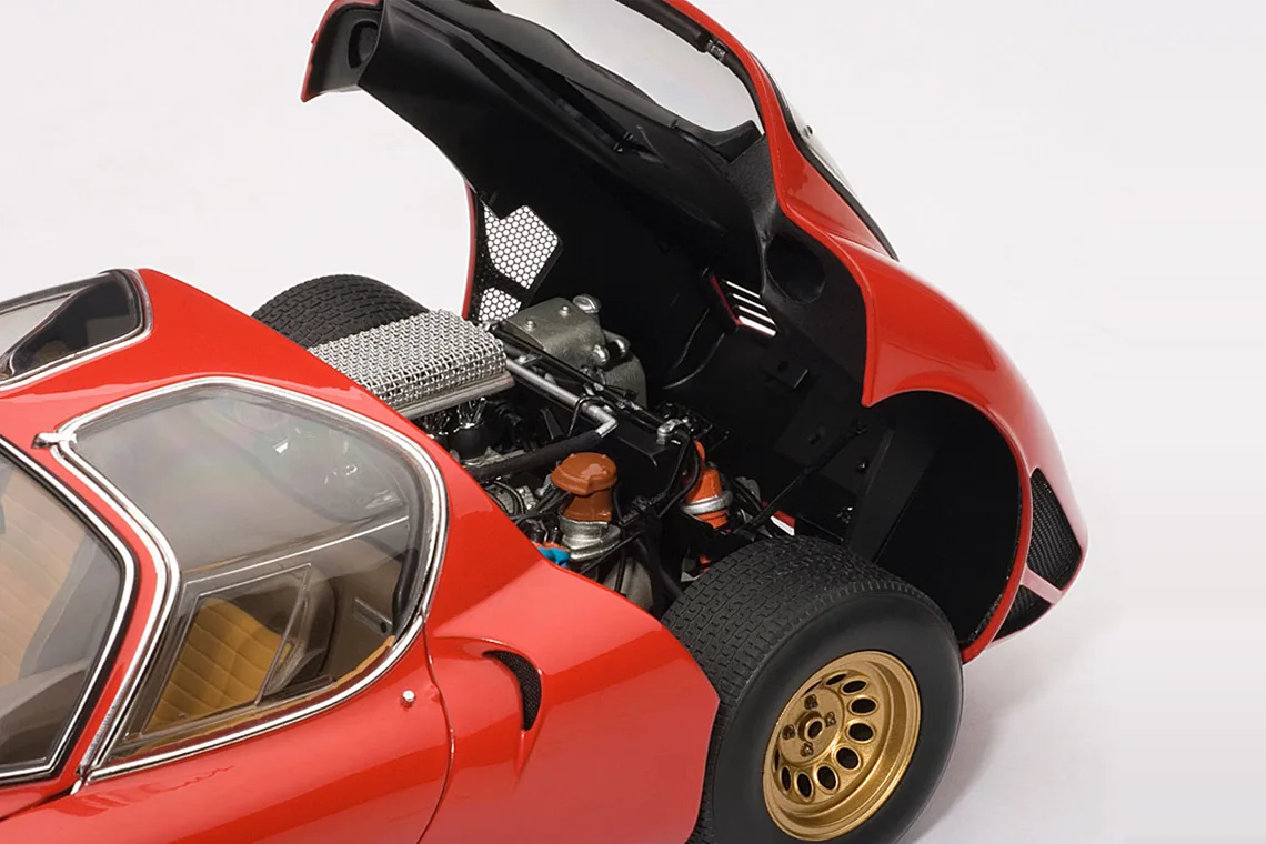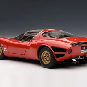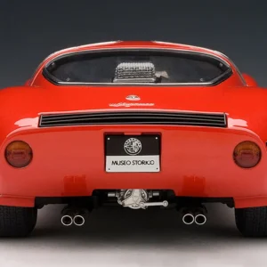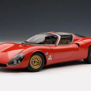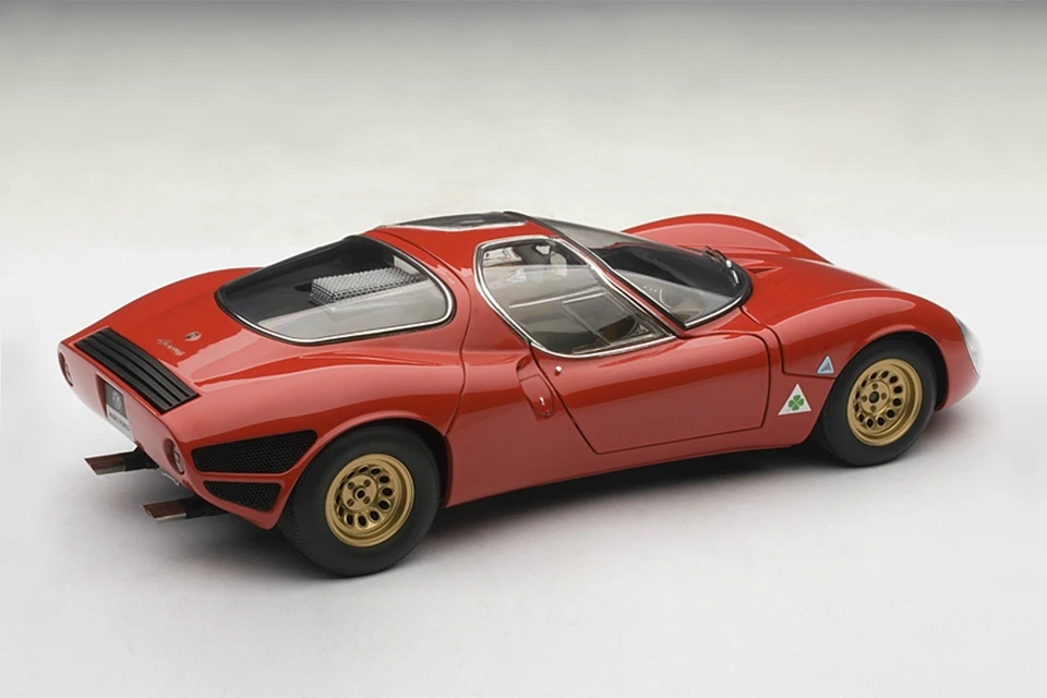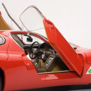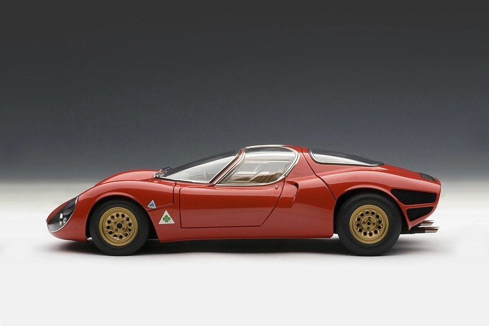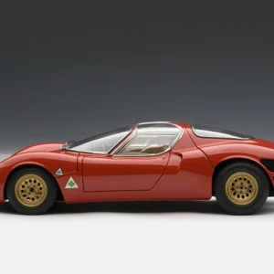 A masterpiece by designer Franco Scaglione, the 33 Stradale is considered one of the most beautiful sports cars of all time. With this model, Autoart reproduces one of the two prototypes that were manufactured, with its characteristic twin headlight configuration. It shares the magnesium chassis with the Tipo 33 racing variant and a rear mid-mounted V8 engine, detuned to 230 PS. However, Alfa Romeo did sell just a few, partly due to its extremely high price (more expensive than any Ferrari of the time).