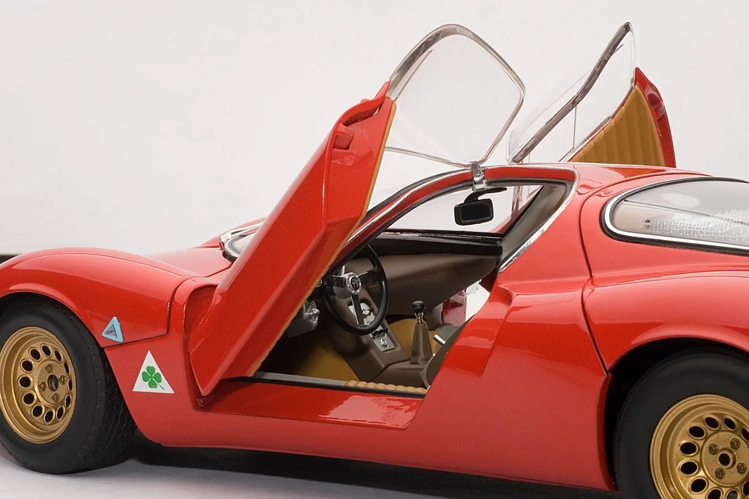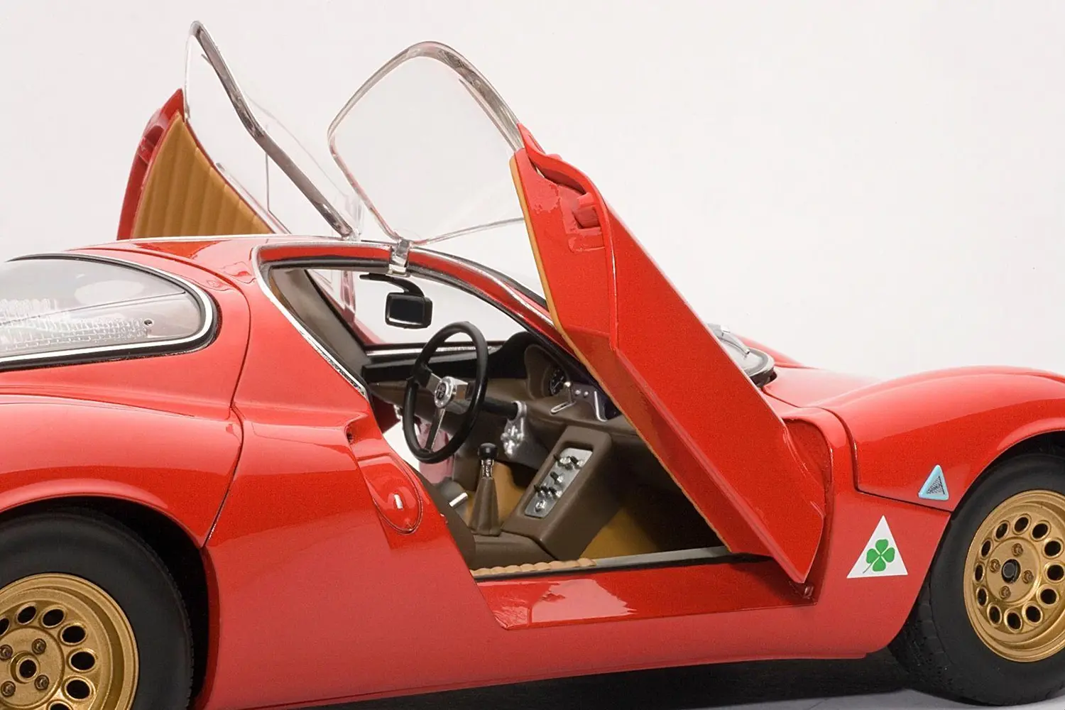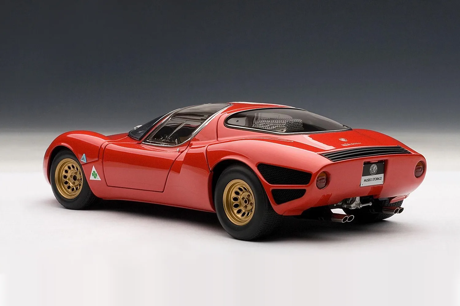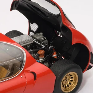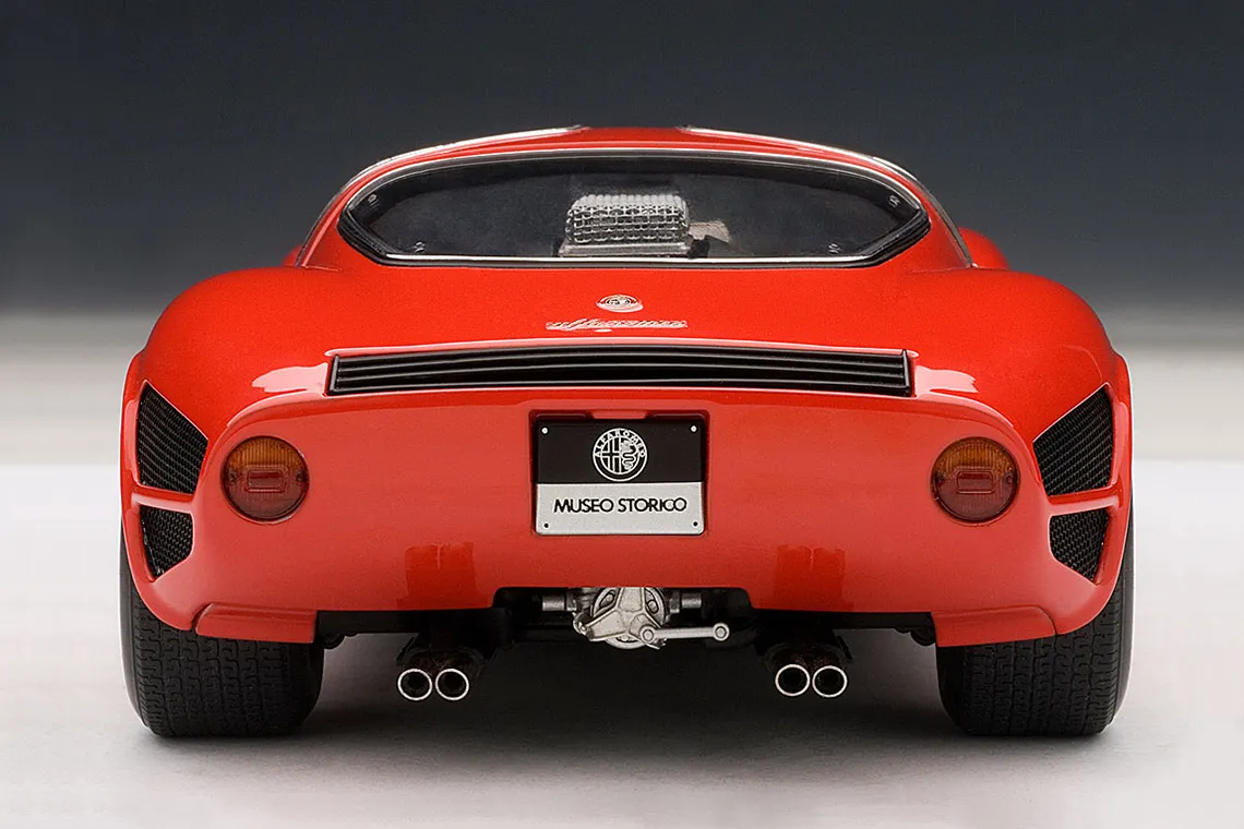 A masterpiece by designer Franco Scaglione, the 33 Stradale is considered one of the most beautiful sports cars of all time. With this model, Autoart reproduces one of the two prototypes that were manufactured, with its characteristic twin headlight configuration. It shares the magnesium chassis with the Tipo 33 racing variant and a rear mid-mounted V8 engine, detuned to 230 PS. However, Alfa Romeo did sell just a few, partly due to its extremely high price (more expensive than any Ferrari of the time).