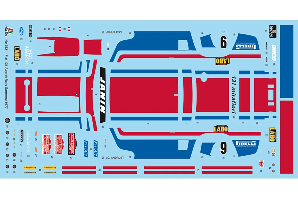 131 Abarth’s performance -combined with that of the veteran Stratos- secured another World Rally Championship title for the FIAT group in 1977. Andruet contributed valuable points with this victory in that season’s Sanremo Rally, which Italeri has reproduced in this 1/24 scale kit.