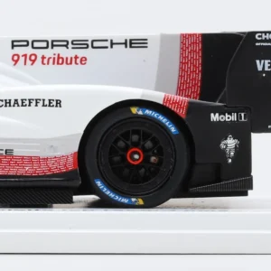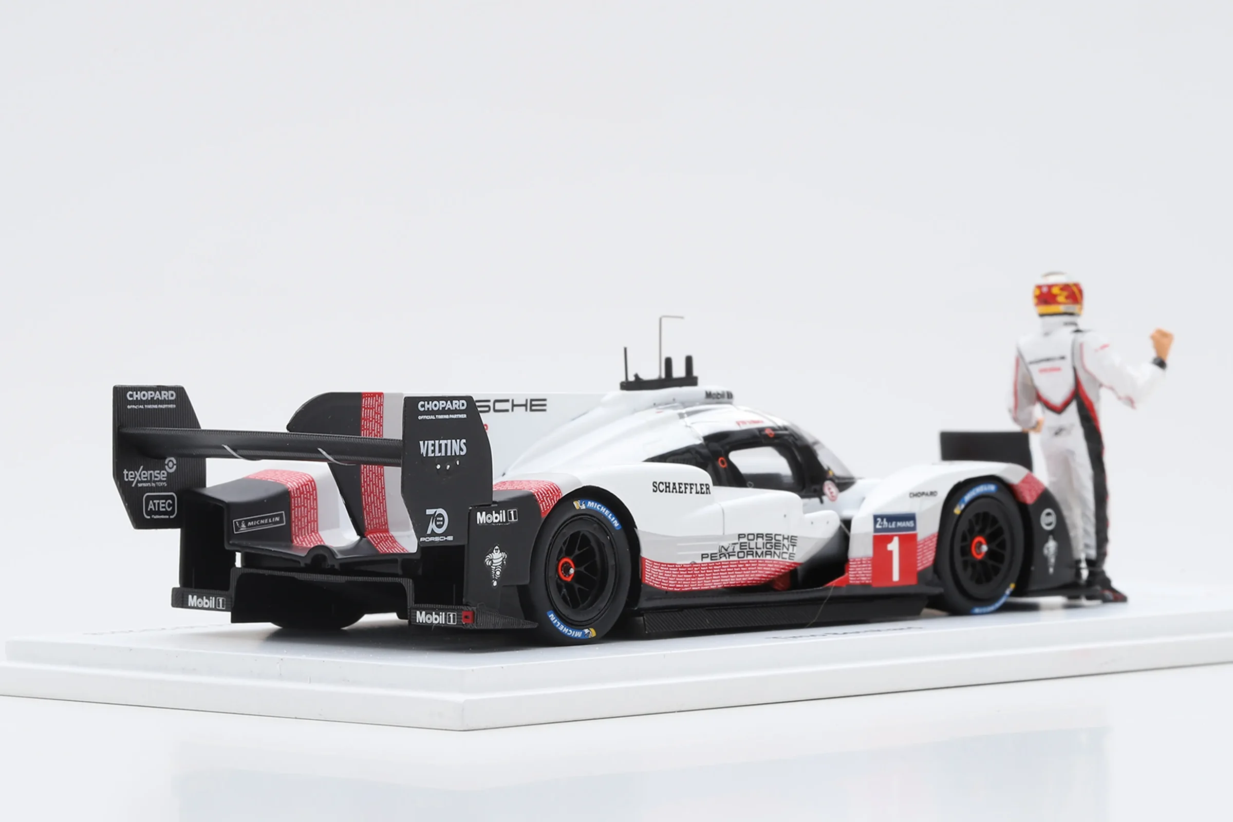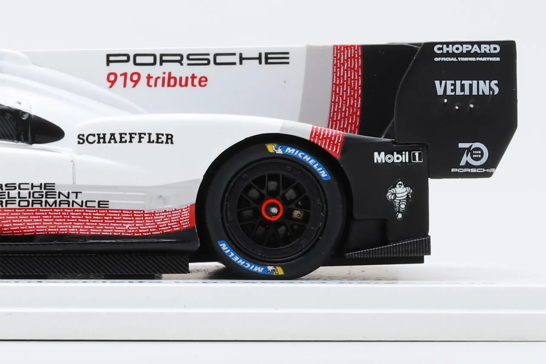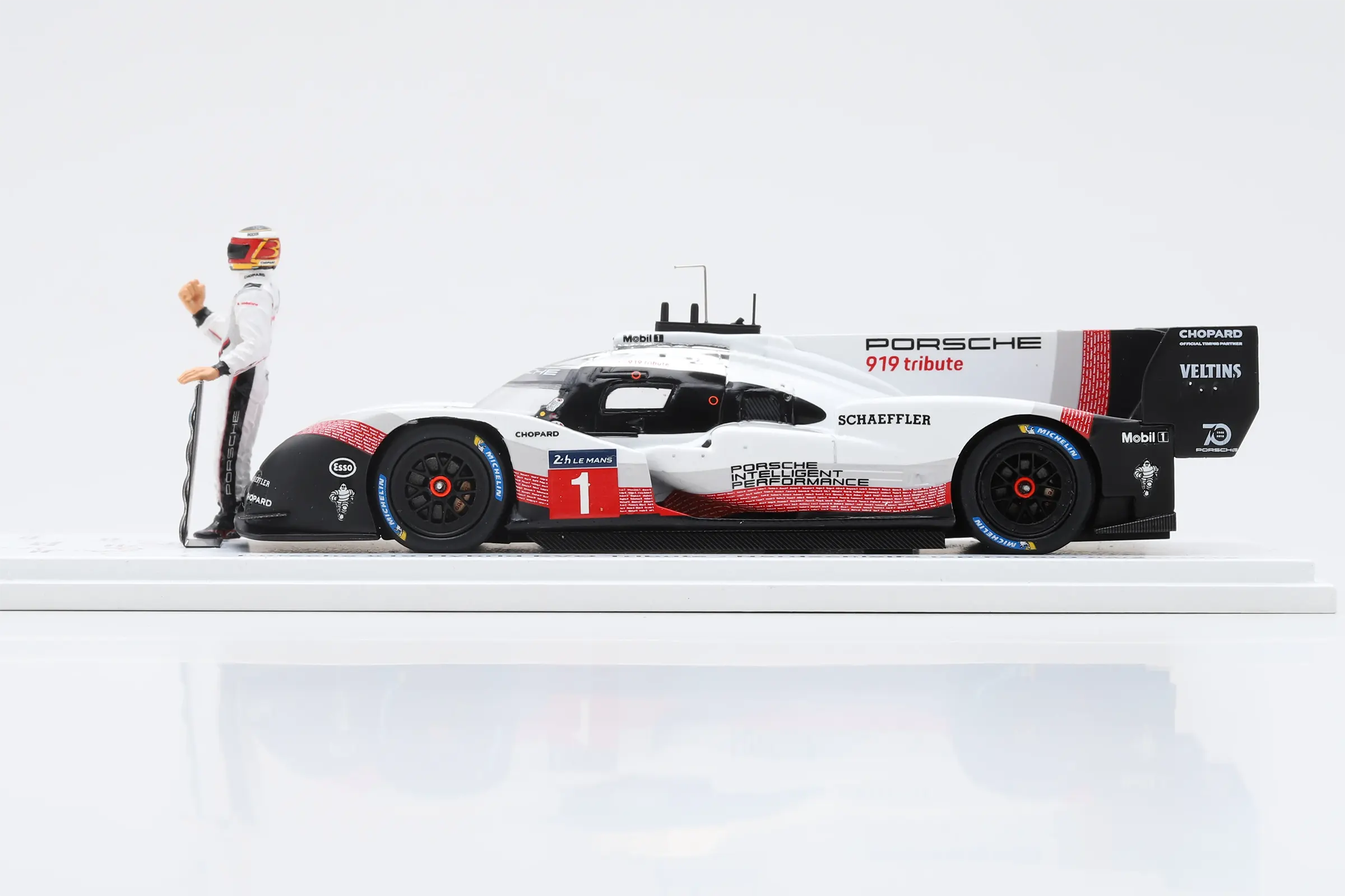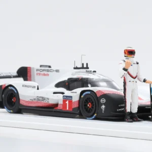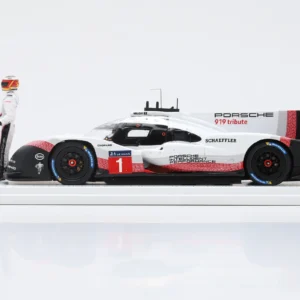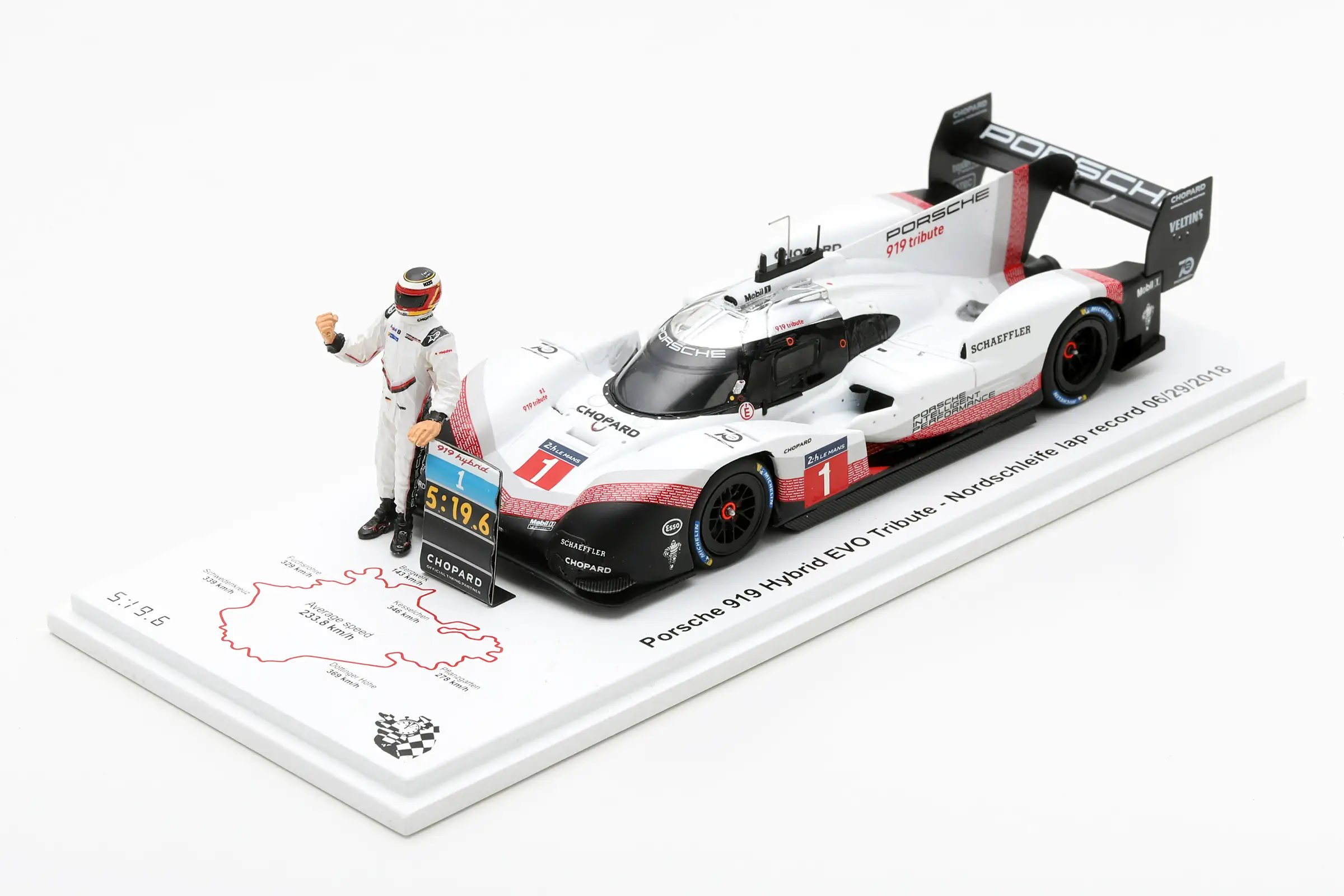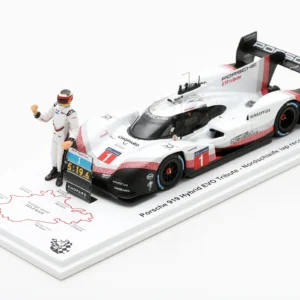 After winning Le Mans three times in a row, the 919 was stripped of all restrictions to make it the fastest car possible: thus in 2018 the ‘Evo’ version was built, which smashed the absolute record for the Nürburgring Nordschleife circuit set in 1983. It lowered the record by almost a minute! Spark immortalises this moment in 1/43 scale, including the driver and the stand with 5 min 19.6 sec time labelled.